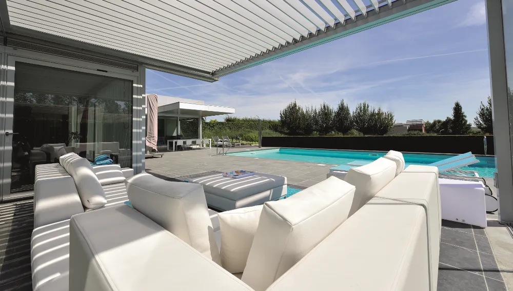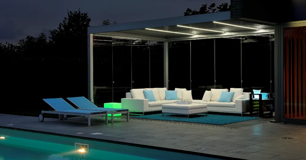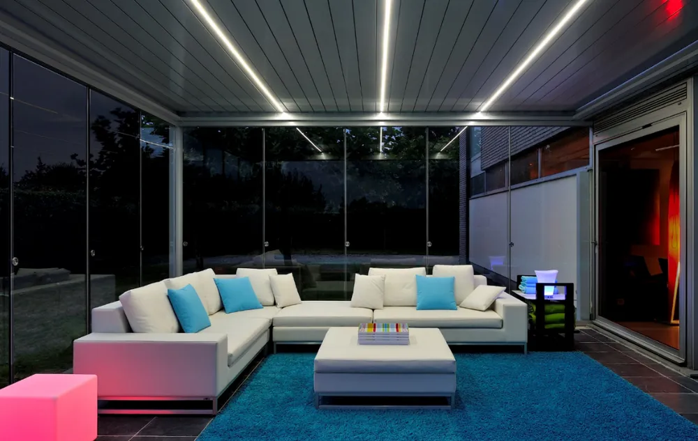Wanneer uw terras wordt overdekt door een veranda met een lamellendak, houdt u controle over het weer. Is het lekker zonnig, dan kantel u de lamellen open en geniet u meteen van het heerlijke weer. Betrekt het of begint het te regenen? Dan kantelt u de lamellen dicht en zit u meteen droog. Ook wind deert niet, want met de fraaie glazen schuifwanden om de veranda heen kunt u de zijkanten open laten of naar wens helemaal afsluiten, zonder daarbij een opgesloten gevoel te hebben. Sfeerverlichting en terrasverwarming zorgen ervoor dat u zelfs in de winter nog “buiten” kunt zitten!